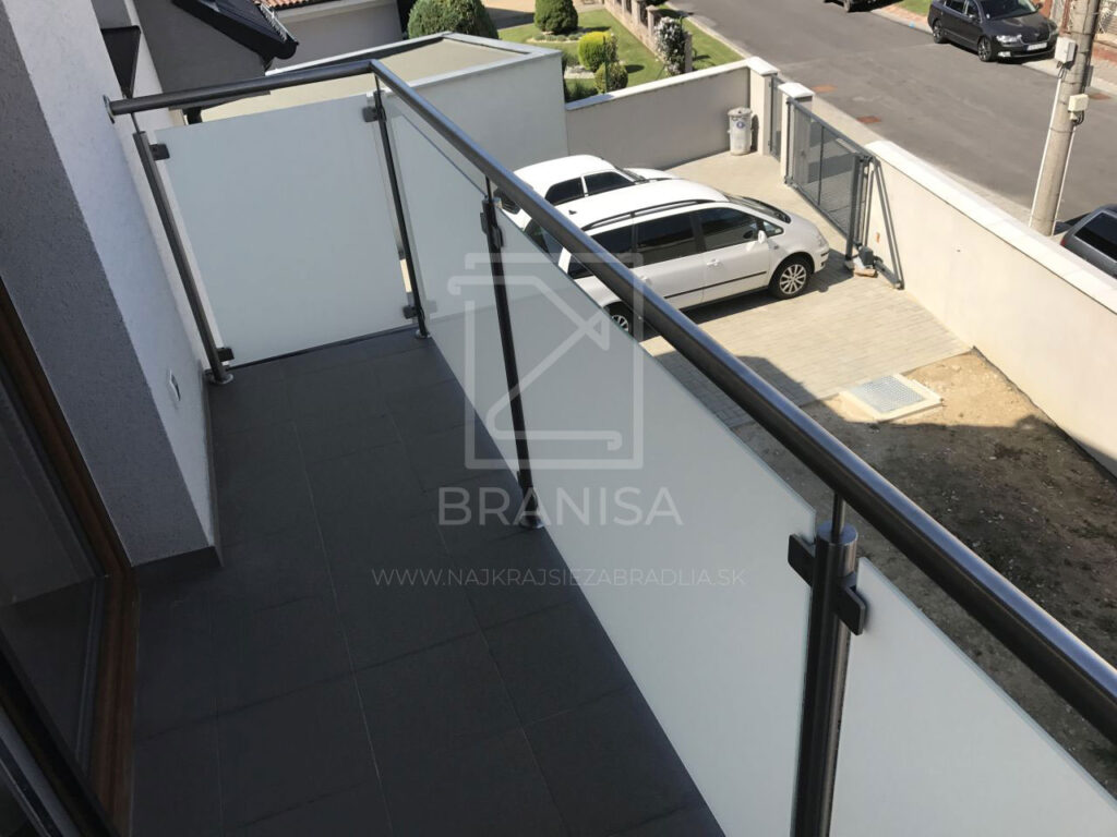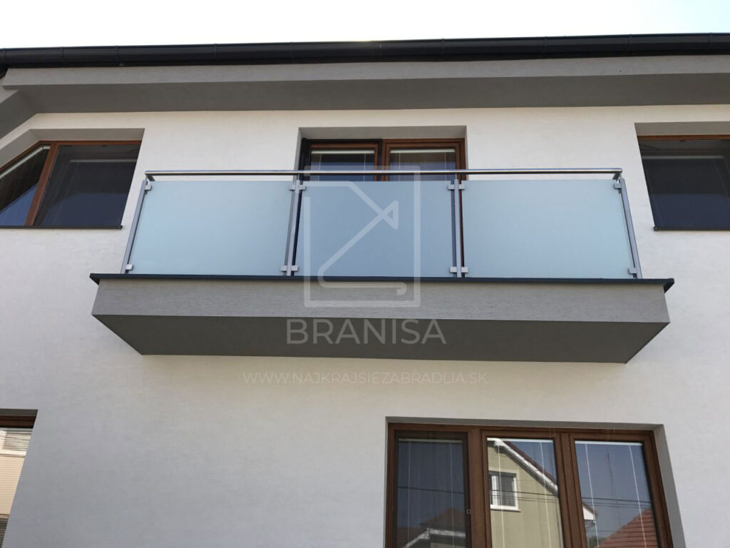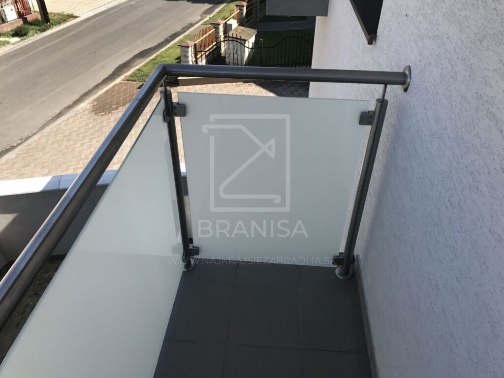 Nerezové zábradlie s mliečnym sklom na balkóne novostavby je kotvené zvrchu. Je zhotovené z kruhových profilov a výplň tvorí bezpečnostné sklo.
