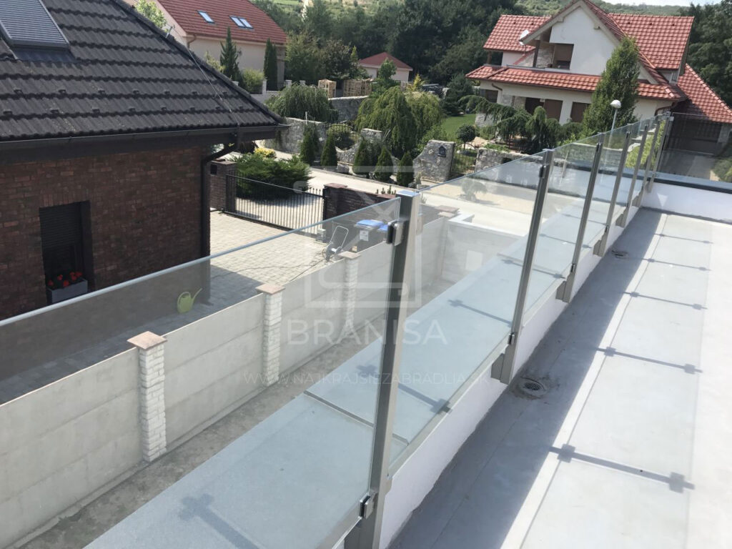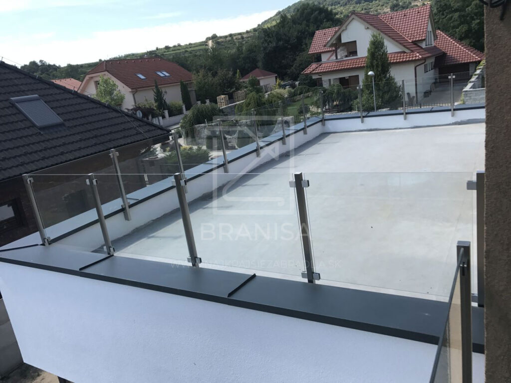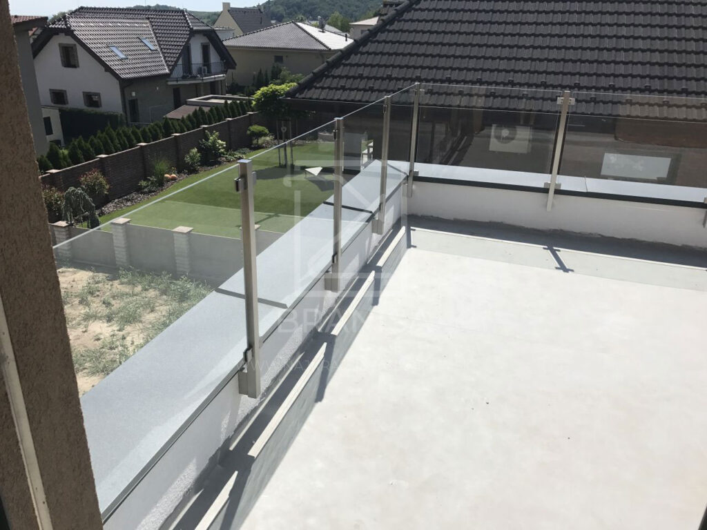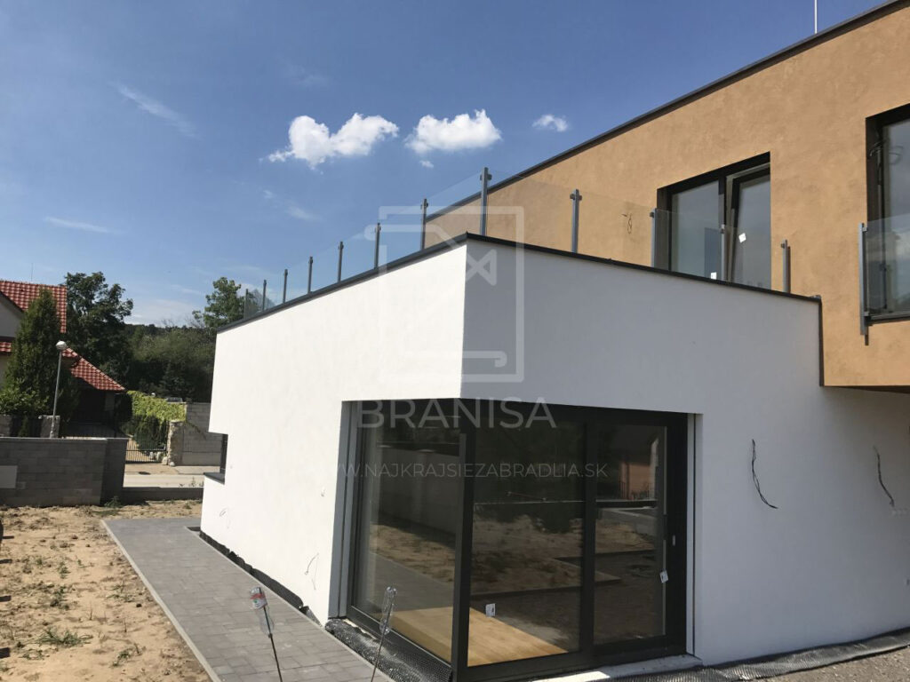 Na terase novostavby rodinného domu je v tomto prípade osadené nerezové zábradlie so sklom. Zábradlie je ukotvené zboku do atiky a tvoria ho samostatné stojky zo štvorcových profilov bez madla a ako výplň je použité číre bezpečnostné sklo.