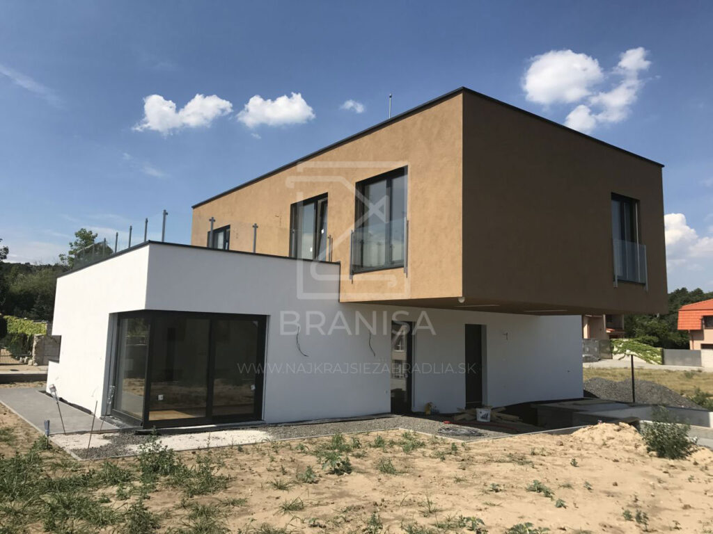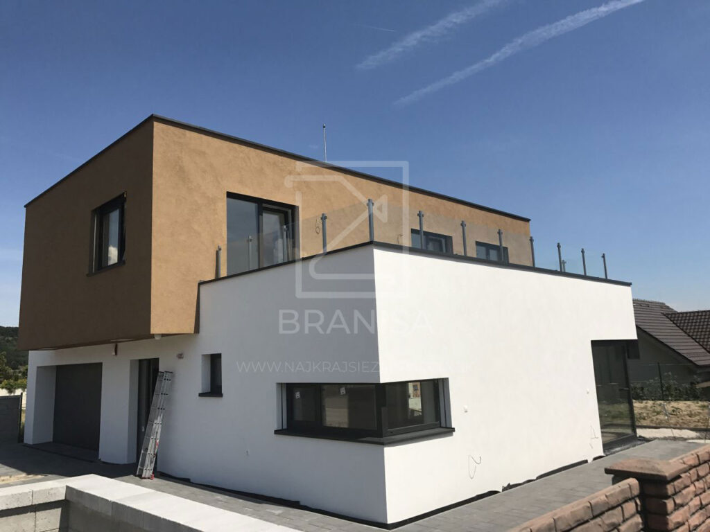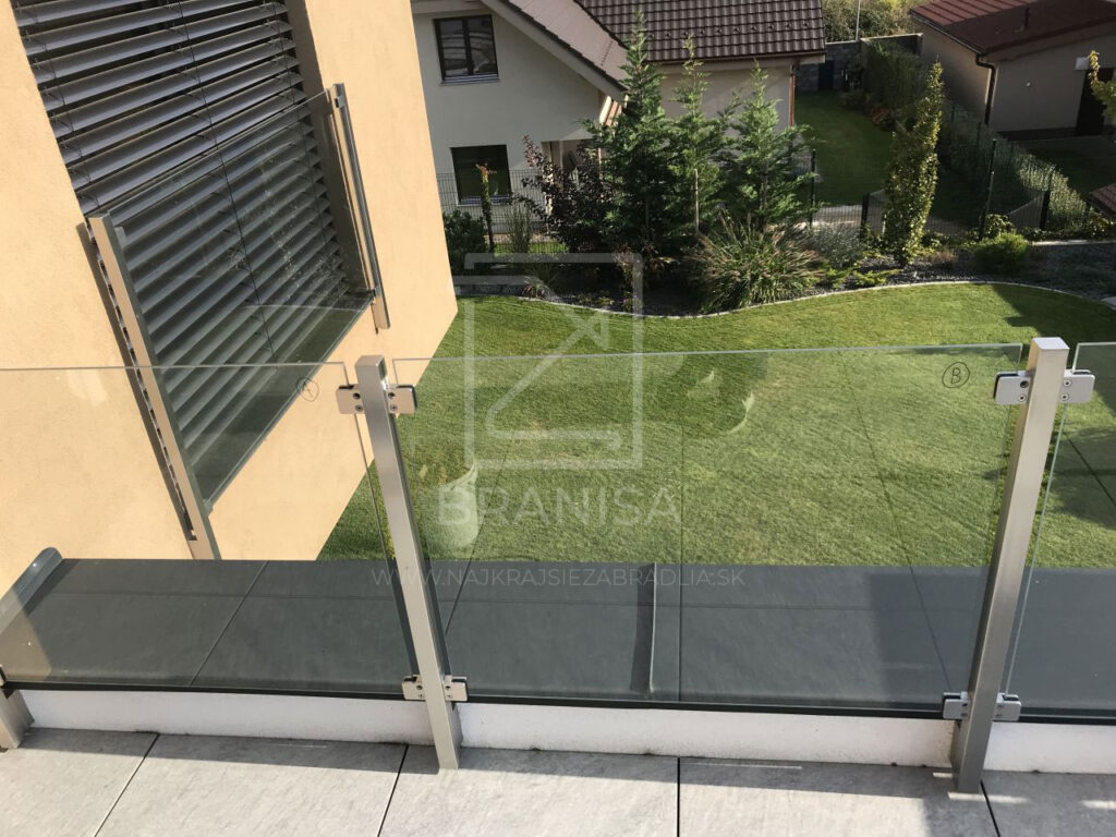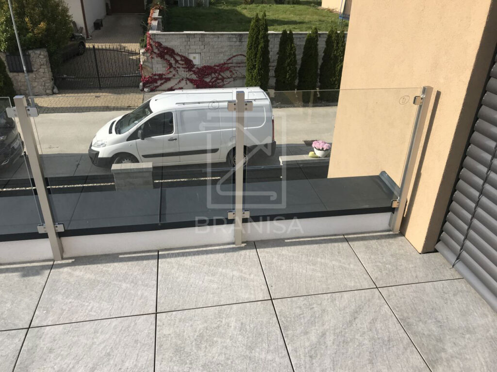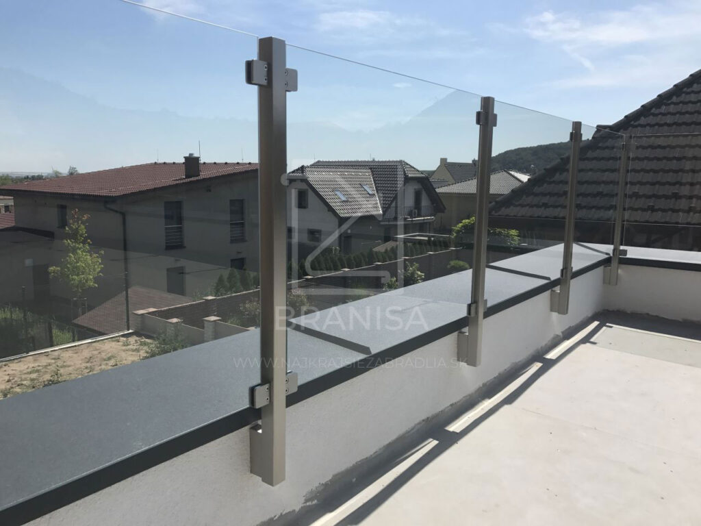 Na terase novostavby rodinného domu je v tomto prípade osadené nerezové zábradlie so sklom. Zábradlie je ukotvené zboku do atiky a tvoria ho samostatné stojky zo štvorcových profilov bez madla a ako výplň je použité číre bezpečnostné sklo.