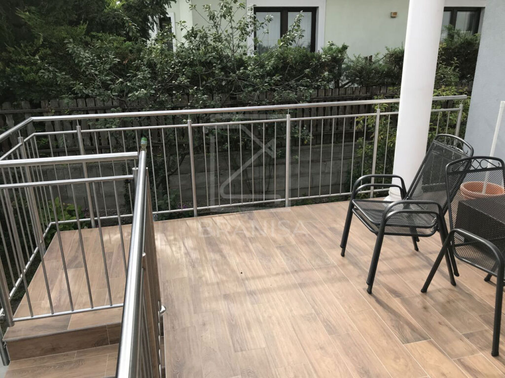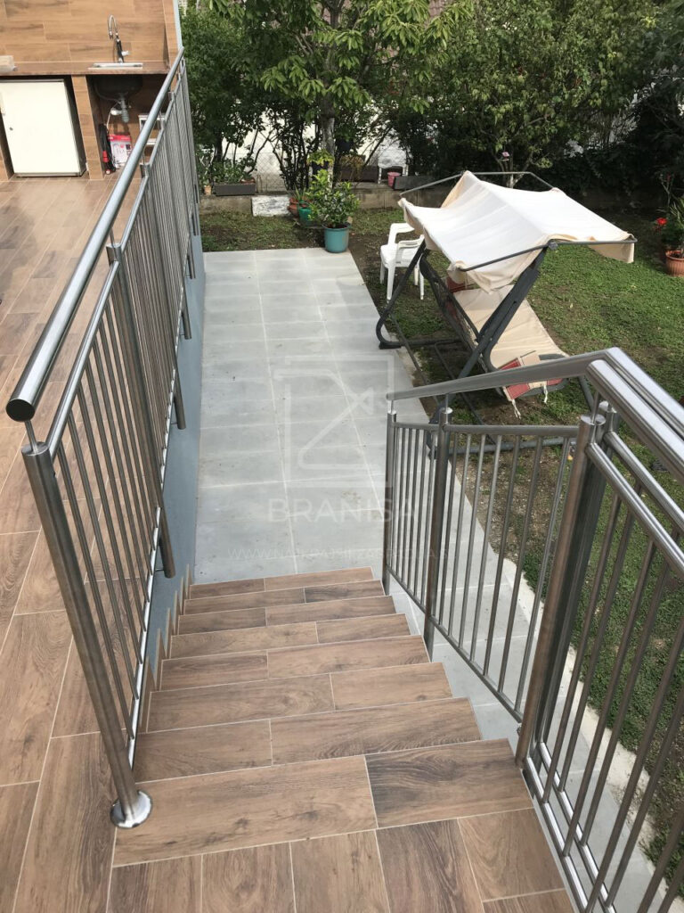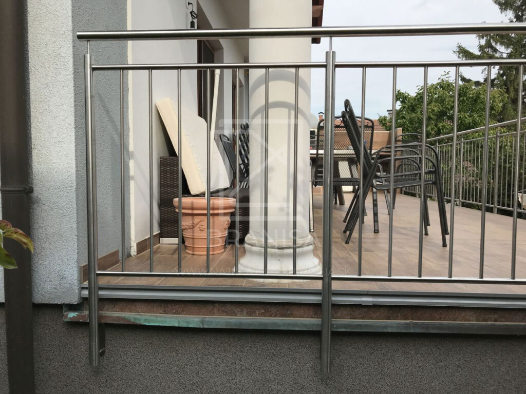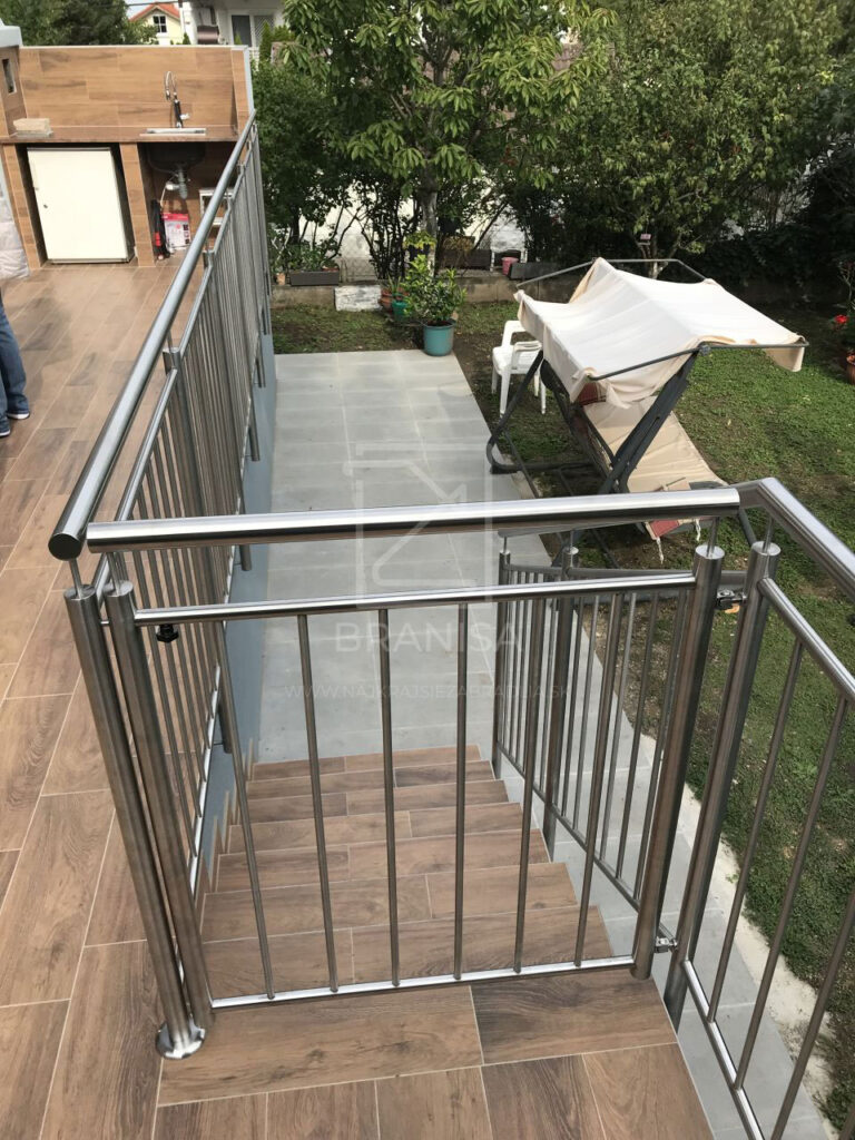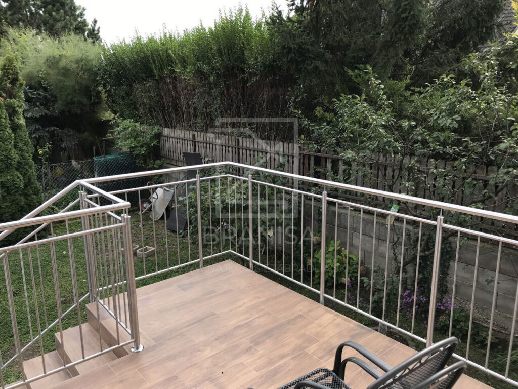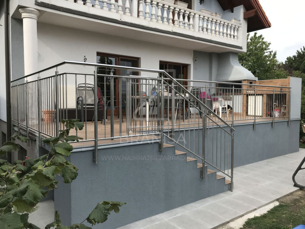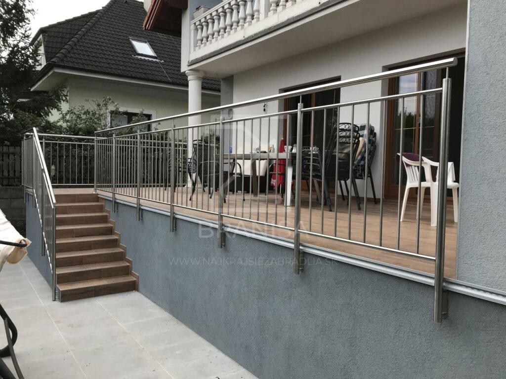 Zboku kotvené nerezové zábradlie na terase má zvislú výplň. Na jeho výrobu boli použité kruhové profily. Súčasťou zábradlia je aj bránka v rovnakom prevedení, ako zvyšok zábradlia. Bránka slúži ako zábrana pre malé deti.