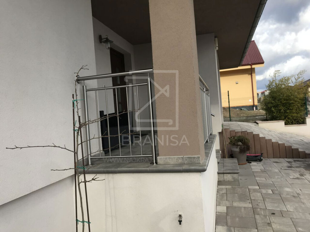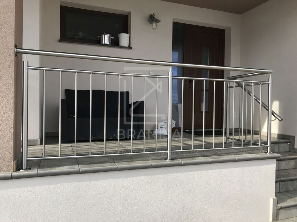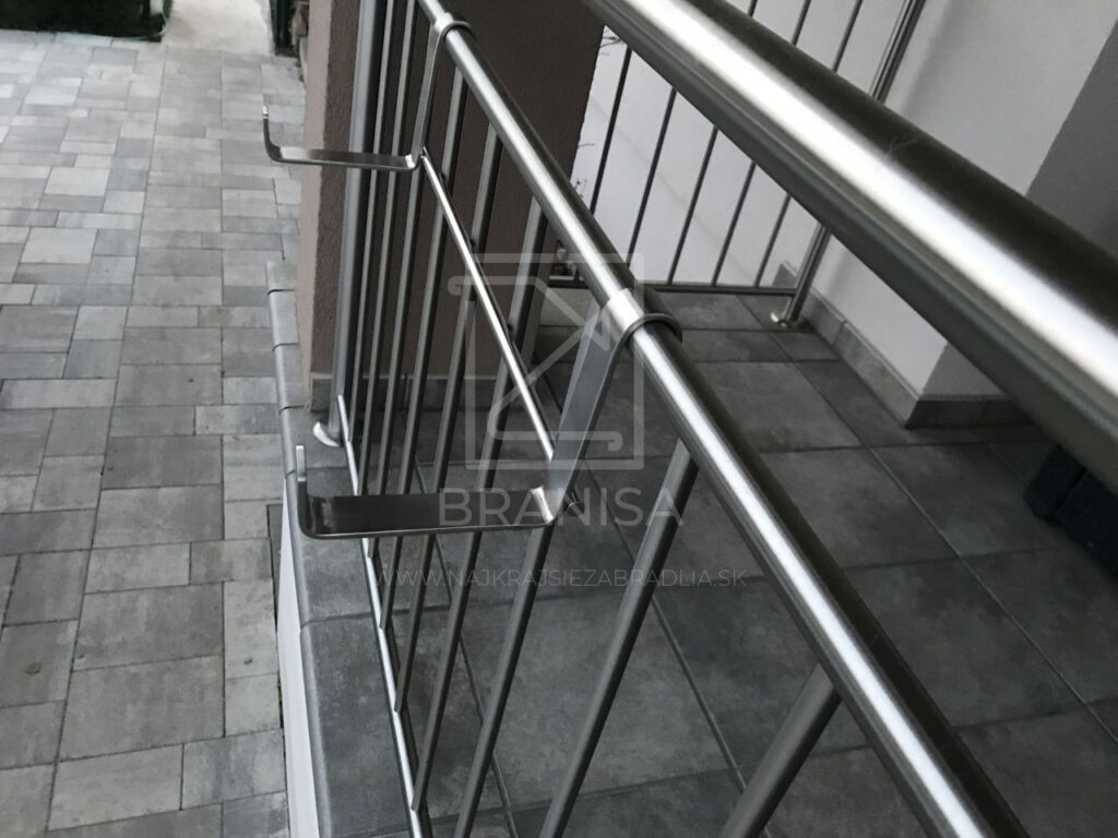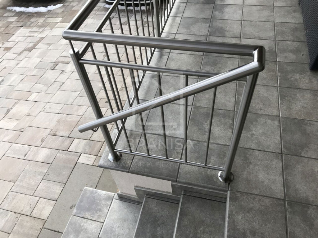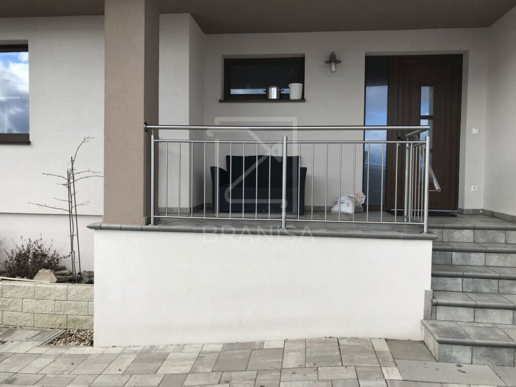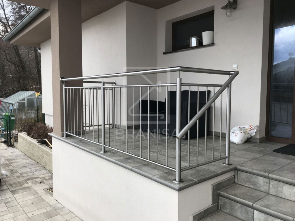 Nerezové zábradlie so zvislou výplňou je v tomto prípade ukotvené zvrchu do podlahy. Na schodisku pred vchodom do domu je aj madlo, ktoré je súčasťou zábradlia a je plynulo prepojené s madlom zábradlia.